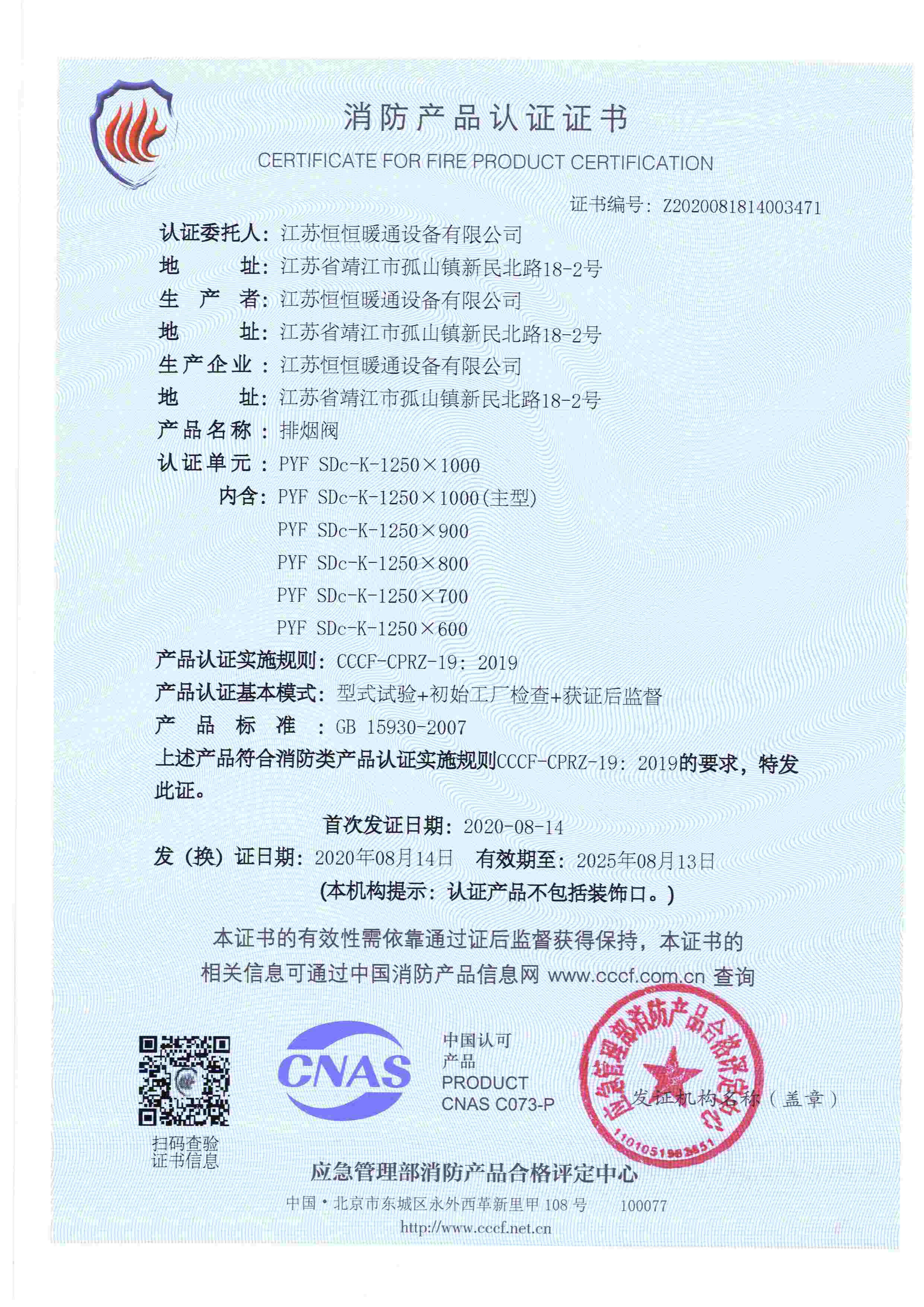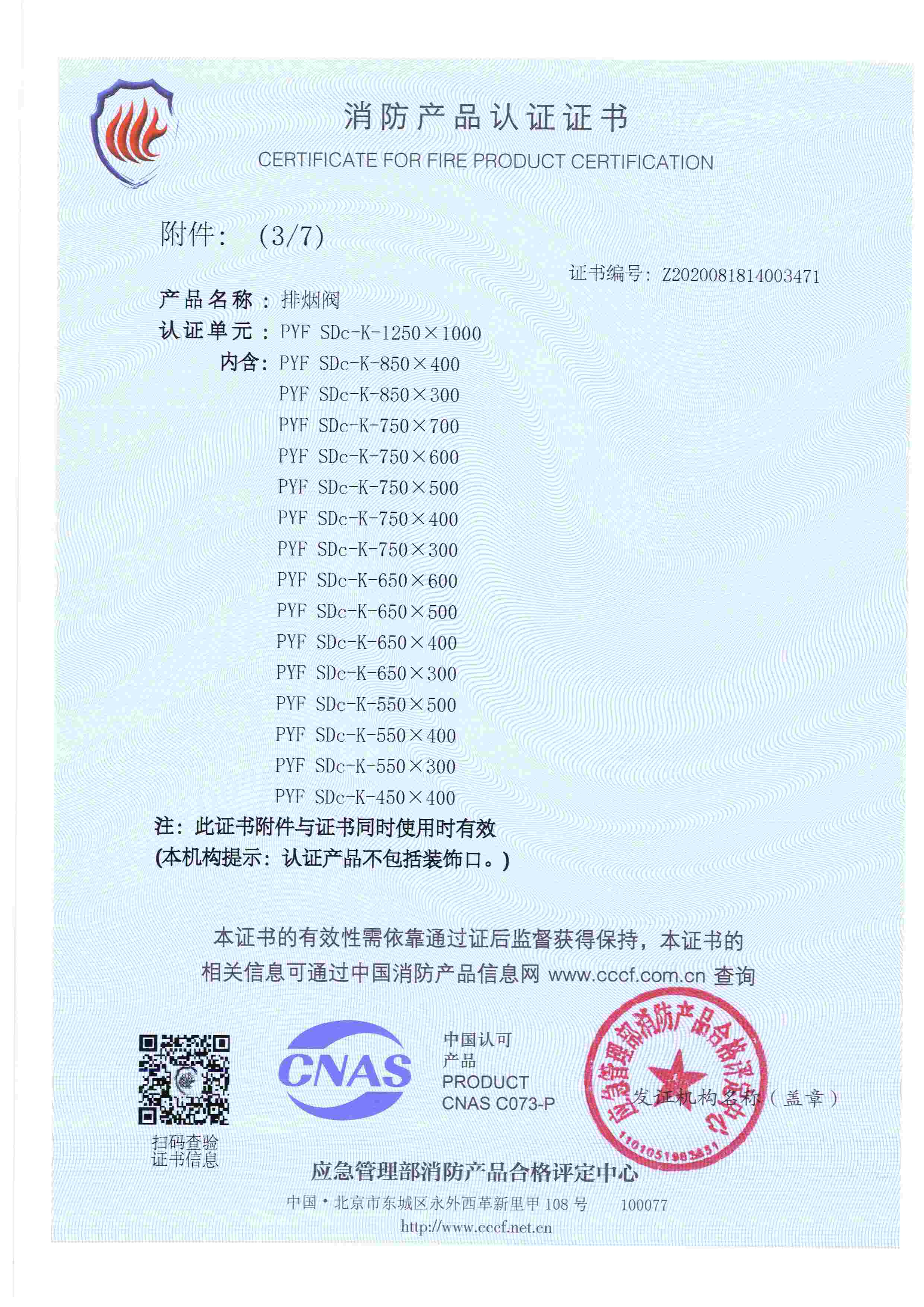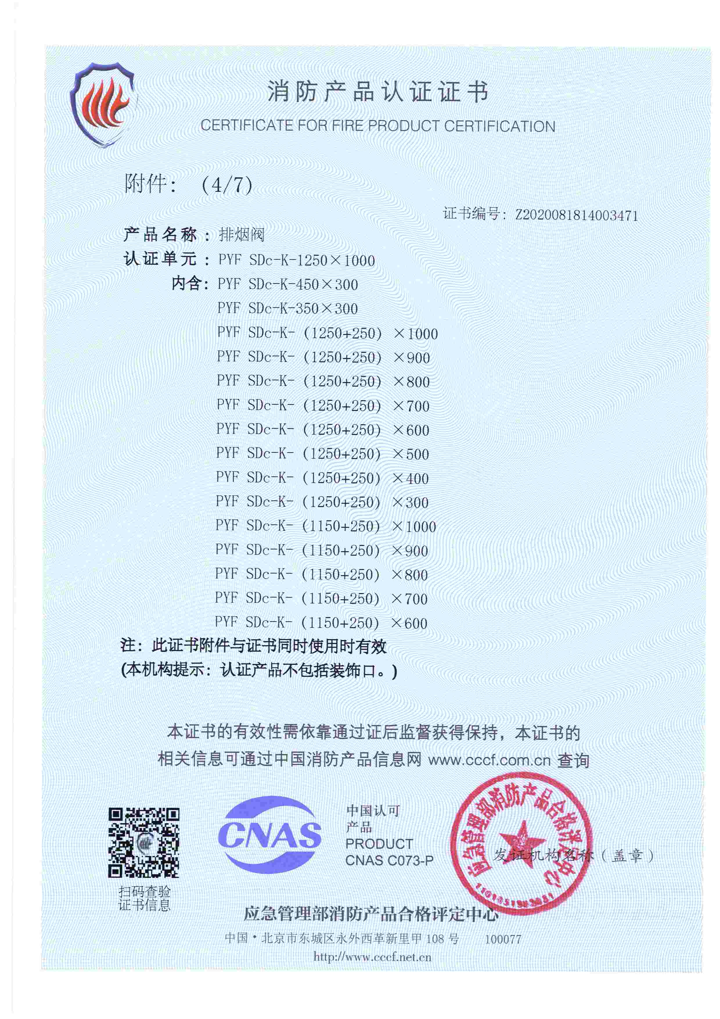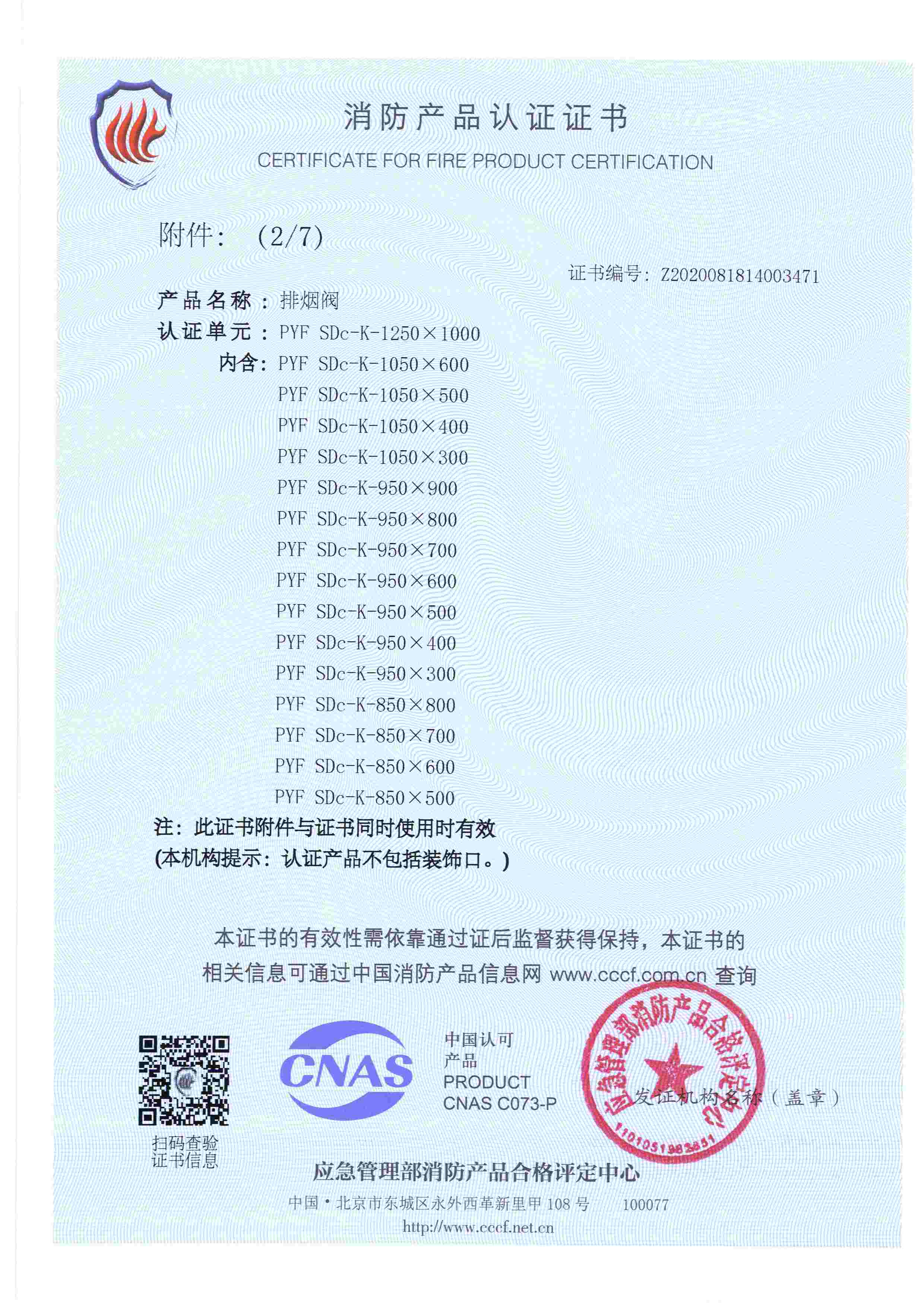 排煙防火閥認(rèn)證證書(shū)2000X1000